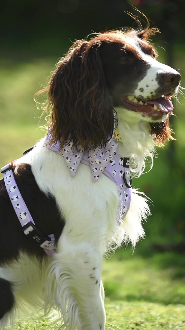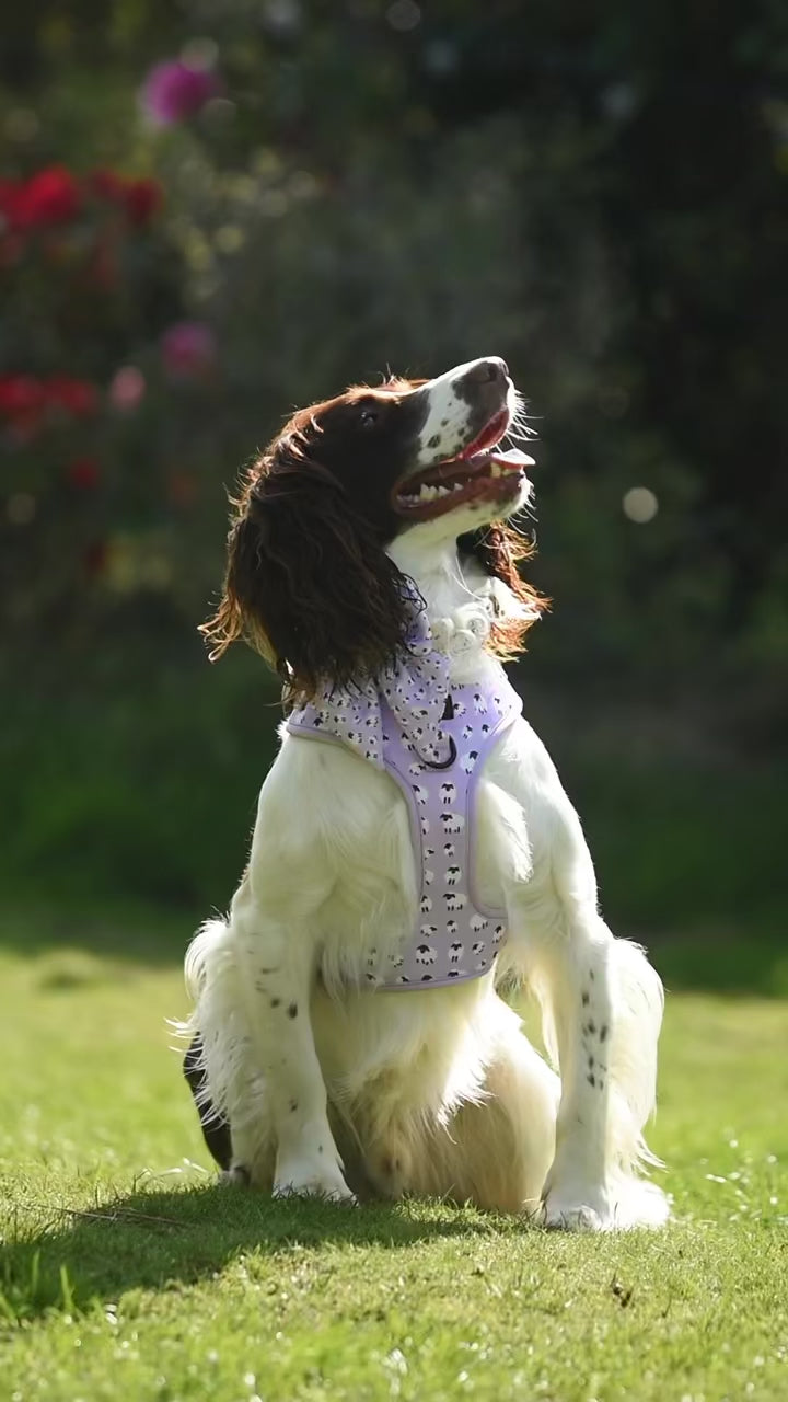 Our Lilac Sheep adjustable harness. A super fun and colourful alternative to traditional dog collars. Quick and easy to slide over your pup’s head, can be adjusted at the neck and chest to get the perfect fit and is as comfortable as possible.